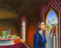 This is the cover illustration of The Bretton Katt Alliance. It depicts the alien Rusorin standing at the window of the Neoran Consulate on the evening of June 23, 2441. She is looking at the dome of Bretton Katt's City Hall. Fine work on the part of Mr. Cortopassi.